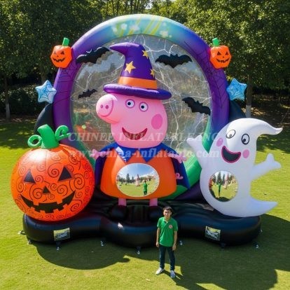 Bring seasonal magic to your venue with the Cartoon3-348 Peppa Pig Halloween Inflatable Cartoons by Chinee Inflatables. This cheerful display features a large Peppa Pig dressed as a friendly witch, flanked by a smiling ghost, carved pumpkin graphics, spiders, and a festive circular backdrop. Designed as a decorative showpiece (not a bouncer or slide), it creates an eye‑catching photo spot that delights families and instantly sets a fun, spooky atmosphere for autumn events.