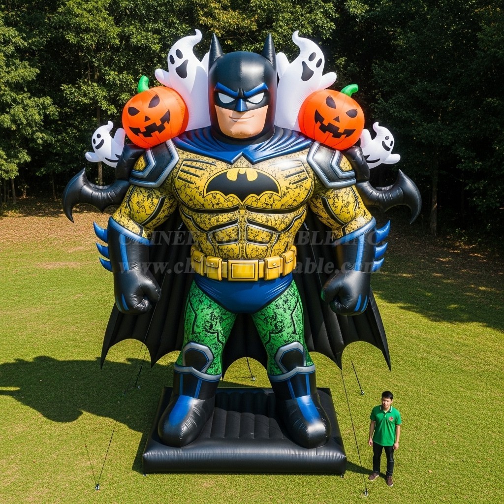 Bring heroic wow-factor to your seasonal displays with the Cartoon3-369 Batman Inflatable Cartoons by Chinee Inflatables Inc. This towering figure showcases the iconic Dark Knight in a bold armored suit, complemented by playful Halloween elements like friendly ghosts and jack-o’-lanterns. Designed as a decorative character inflatable, it is perfect for entrances, photo ops, and brand-forward setups where visual impact matters more than active play.
