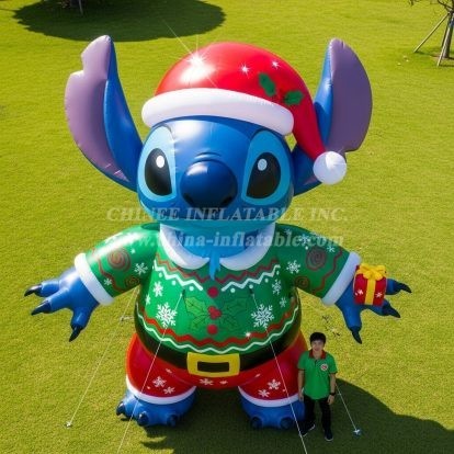 Bring holiday cheer to any venue with the Cartoon3-539 Lilo & Stitch Christmas Inflatable Cartoons display from Chinee Inflatables Inc. This eye-catching piece features a large blue character in a festive sweater and Santa hat, making it a perfect seasonal centerpiece for squares, shopping streets, school lawns, theme parks, and winter festivals. Designed as a decorative inflatable (not for bouncing), it creates instant photo opportunities and draws attention from a distance.