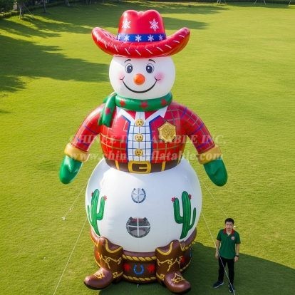 Bring festive charm and Western flair to your event with our Cowboy Snowman inflatable from Chinee Inflatables Inc. This towering character features a cheerful snowman dressed in a plaid shirt, sheriff badge, and oversized cowboy hat and boots, complete with cactus graphics for a playful Wild West vibe. Designed as a decoration piece, it’s perfect for entrances, photo ops, rooftops, plazas, parades, and winter markets where you want to draw attention instantly.