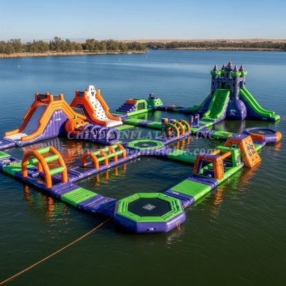 Bring thrilling, spooky fun to the water with the S368 Halloween Theme Water Park by Chinee Inflatables Inc. This large-capacity floating adventure park features vibrant purple, green, and orange colors with a haunted-castle slide, ghost-clad climbing wall, pumpkin elements, arches, balance paths, and jump pads to keep guests challenged and smiling for hours. Designed for lakes, calm beaches, and resort lagoons, the S368 integrates multiple routes so participants can slide, climb, crawl, and sprint across interconnected modules without bottlenecks.