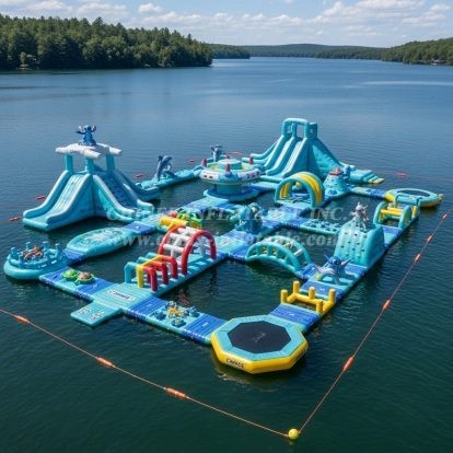 Make a splash with the S370 Lilo & Stitch Water Park from Chinee Inflatables Inc., a sprawling floating adventure designed for resorts, camps, lakes, and beachfront venues. This modular park blends adorable character styling with serious aquatic thrills, featuring multi-lane water slides, climbing walls, arched bridges, balance beams, a floating trampoline zone, and maze-like walkways that invite continuous exploration. Eye-catching Lilo & Stitch figures and playful dolphins set a cheerful, ocean-inspired vibe that draws crowds of all ages.