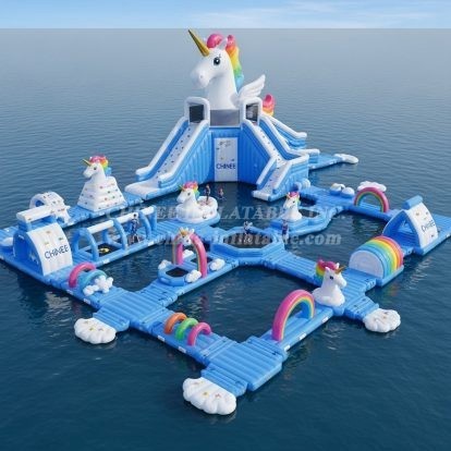 Make a splash with the S372 Unicorn Theme Water Park from Chinee Inflatables Inc., a captivating floating adventure designed to turn lakes, seaside resorts, and camps into unforgettable destinations. Centered around a majestic unicorn tower with dual slides, this modular park connects a variety of activities—balance paths, climb walls, arches, splash zones, and bounce pads—creating a continuous circuit that keeps guests moving, laughing, and competing. Bright rainbows and cloud details deliver instant visual appeal that draws families from afar and sets a premium, Instagram‑ready scene.