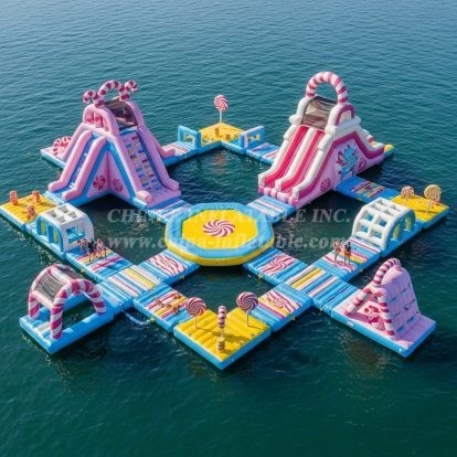 Turn your waterfront into a headline attraction with the S410 Candy Theme Water Park by Chinee Inflatables Inc. This vibrant floating course blends towering slides, sprint lanes, tunnels, and splash zones into a sweet, color‑popped layout that delights guests of all ages. The eye‑catching candy canes, lollipop posts, and swirl platforms create an immediate photo magnet while guiding participants through multiple activity loops for continuous play and high throughput.