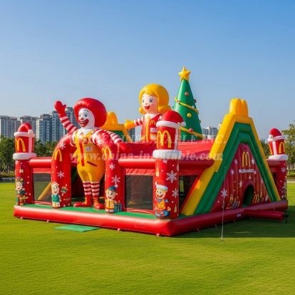 Bring instant holiday cheer to your event with the T2-8626 Mcdonald Christmas Theme Inflatable Bouncer. This vibrant unit features cheerful clown mascots, festive red-and-green color blocking, and a towering Christmas tree centerpiece that instantly sets the scene for winter celebrations. The spacious bounce area invites nonstop jumping fun, while mesh windows on all sides provide clear visibility and constant airflow for safe supervision.