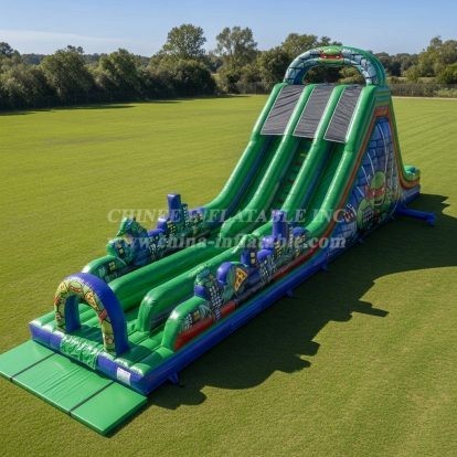 Experience the thrill of this Ninja Turtles themed inflatable water slide, featuring double large lanes and vivid cityscape graphics. Perfect for outdoor fun and excitement, it offers a safe and exhilarating ride for kids and families. Durable materials and bright colors make it a show-stopper at any event or.