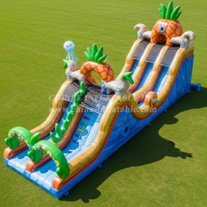 Bring tropical fun to your event with this vibrant Pineapple Inflatable Water Slide. Featuring dual lanes, climbing steps, and colorful marine-themed details like jellyfish, this inflatable offers endless excitement for kids. Perfect for outdoor water play it combines a bright pineapple design with safe, durable construction for hours of summer entertainment.