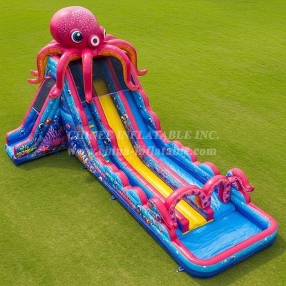 Make a splash with this vibrant Octopus Ocean Inflatable Water Slide! Featuring a giant octopus topper, dual sliding lanes and a shallow splash pool, it delivers big thrills for kids. Bright underwater graphics, secure climbing steps and safety netting ensure fun with safety. Built from heavy-duty PVC for commercial use, it’s perfect for water parks, events, or backyard summer parties.