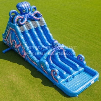 Make a splash with this T8-9222 Octopus Inflatable Water Slide — a giant multi-lane water attraction featuring oversized octopus sculptures and winding tentacles. Built with heavy-duty PVC and reinforced seams, it includes an integrated splash pool and wide sliding lanes for fast, safe fun. Perfect for parks, rentals, festivals, and backyard events seeking standout summer entertainment.