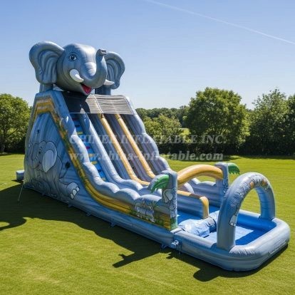 Make a splash with this elephant-themed inflatable water slide featuring a giant elephant head crown, dual sliding lanes, climb ladder and splash pool. Built from commercial-grade PVC with reinforced seams and safety netting, it's perfect for parks, rentals, and summer events. Eye-catching artwork draws kids in while sturdy anchors ensure safe, continuous fun for families and party planners.