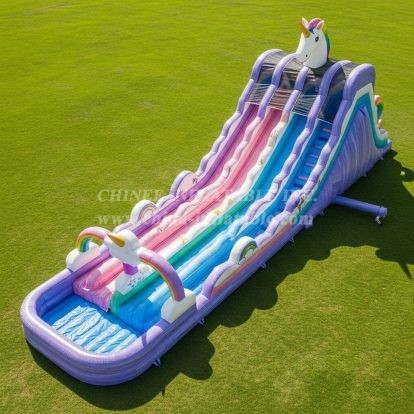 Bring magical summer fun with this giant unicorn inflatable water slide. Featuring dual pastel lanes, rainbow arches and a splash pool landing, it delivers thrilling rides and show-stopping visuals. Built with durable PVC, safety netting and reinforced seams for commercial use, it’s perfect for rentals, parks and backyard parties seeking a standout attraction that delights kids and families.
